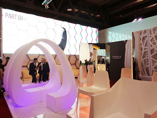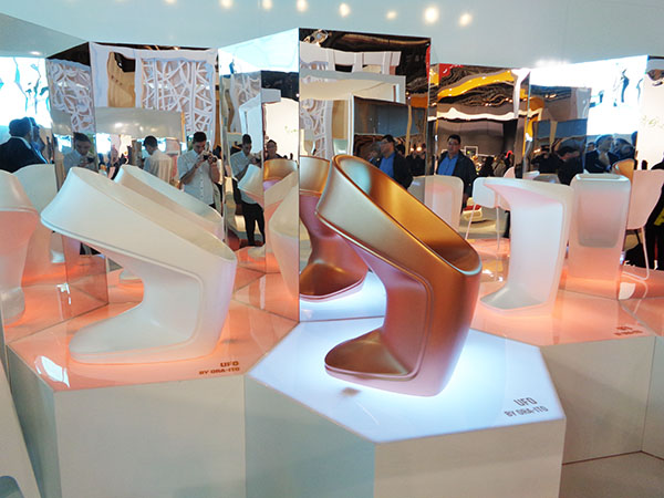 Famous for their use of glamour models in promotional imagery it came as no surprise to find these beauties roaming around the Vondom stand. In stark contrast to Sancal, their neighbours in Hall 10, Vondom shone with brilliant white surfaces, mirrored and reflective plastic plinths and in perhaps homage to Times Square, the largest screen we saw at Salone Milano.