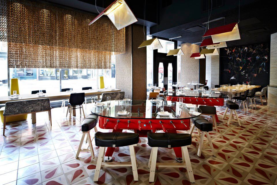 Scattered throughout the restaurant is the Lottus Stool by Lievore Altherr & Molina for Enea, the Andreu World Nub Chair designed by Patricia Urquiola and the Green Chair by Javier Mariscal for M114. Also making an appearance are the Tea Panels from Sancal and the RS Barcelona Football Table.