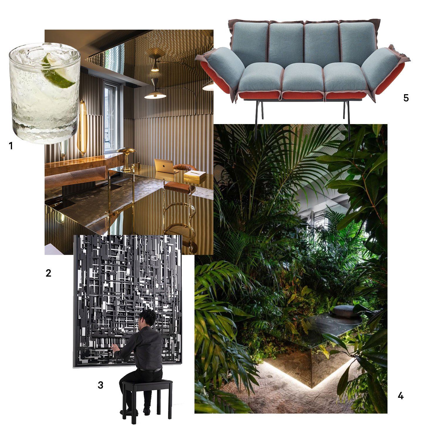 1. G and T (Source: Chowhound), 2. The Newsroom by Storagemilano (Source: Vogue), 3. Yamaha Wall Piano (Source: Yamaha), 4. The Newsroom by Storagemilano (Source: Vogue), 5. Stop Armchair (Source: Sancal)