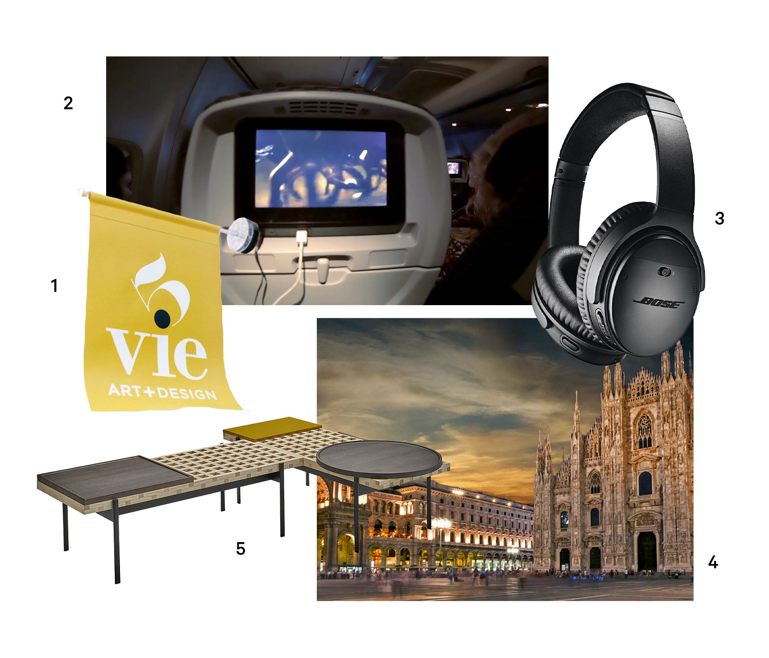 1. 5VIE Flag (Source: Elle Decor), 2. Airplane TV Screen (Source: Video Blocks), 3. BOSE Noise Cancelling Headphones (Source: BOSE), 4. Milan (Source: Boca Do Lobo), 5. Interchange Coffee Table (Source: Sancal)