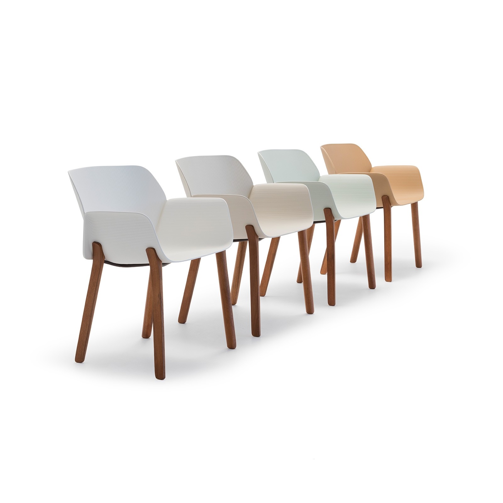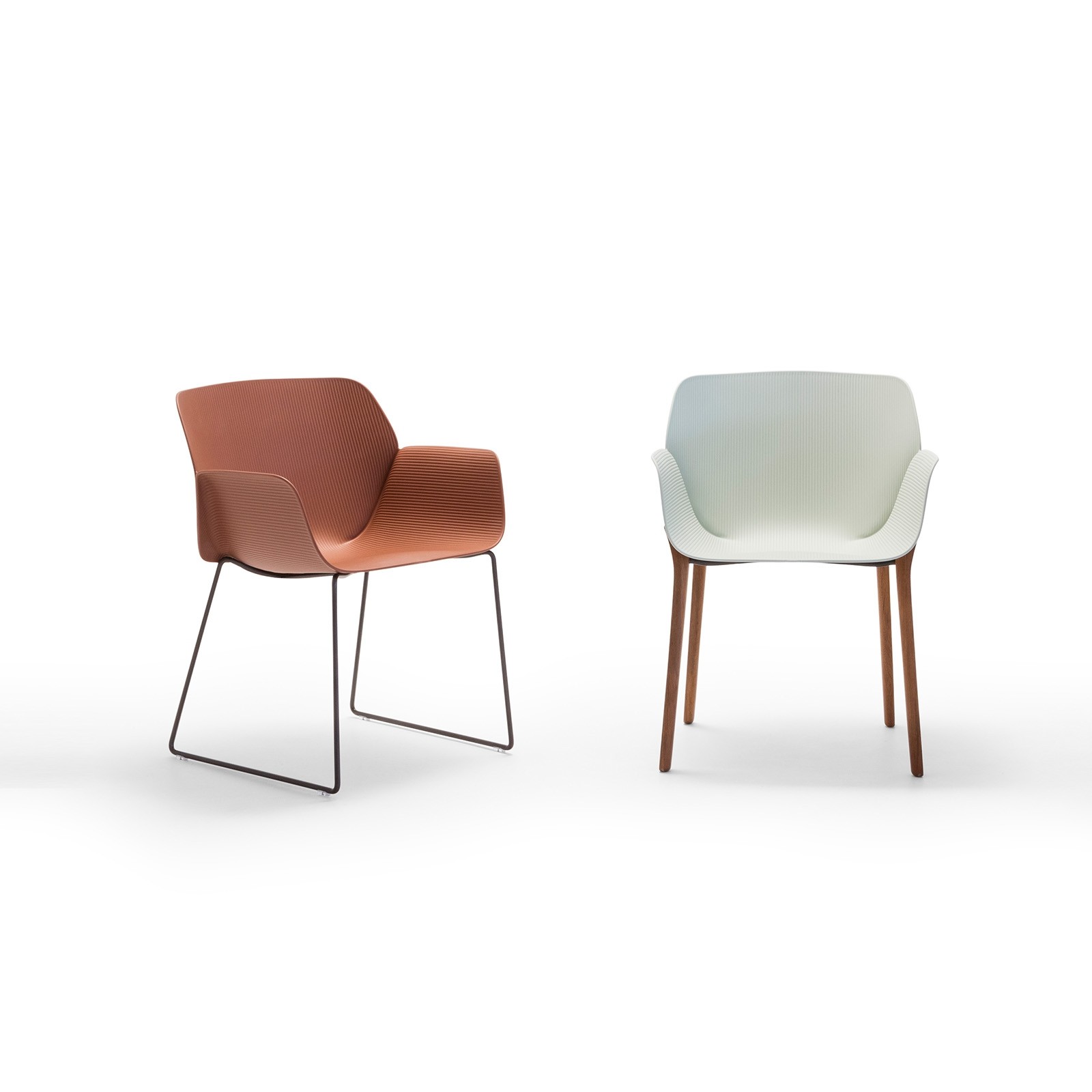 The thermopolymer shell folds along the back of the chair where the arms and backrest meet, suggestive of a doubled-over sheet of paper. The gentle curves of the seat embrace the body and there is subtle linear texture on both sides of the shell.
