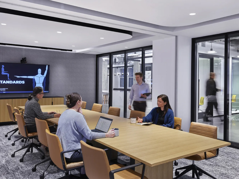 Imagine a meeting room designed to feel more like a chic living room than a sterile conference space. A warm and inviting colour story, tasteful acoustic wall treatments, and comfortable seating all contribute to an environment that fosters conversation and collaboration. Technology is carefully integrated to be as unobtrusive as possible.