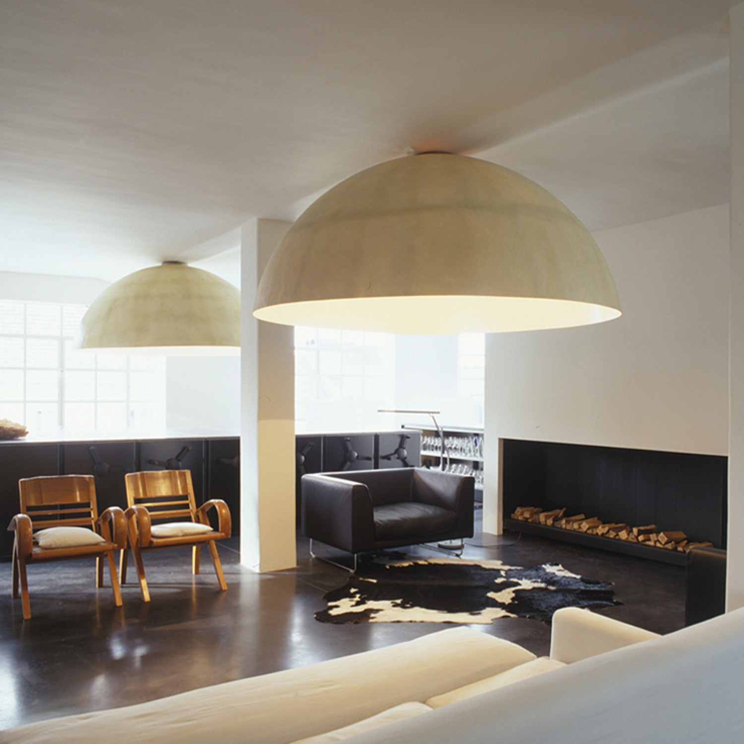 Belgian architect Bart Lens needed a large lamp that would create an encircling sphere of light above the conference table in their office, and so began the search. After a long and fruitless quest, he finally decided to design his own mega-light with the “sphere” of a dome.
