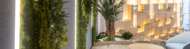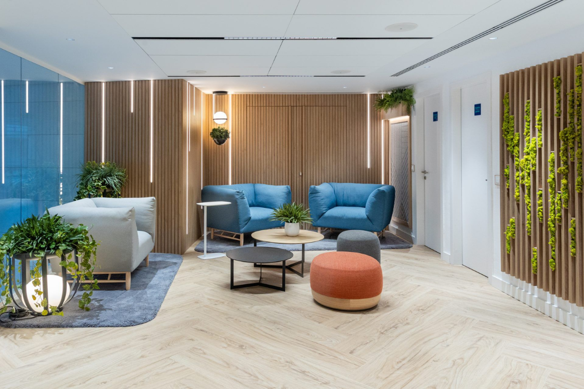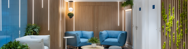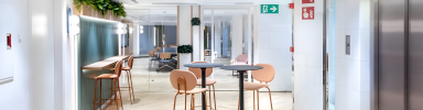 The lobby includes a waiting area and a section with a high bar counter and stools, making it suitable for catering events. The design uses materials and colors consistent with Almirall's previous projects, while adding warmer tones to create a welcoming environment, with seating provided by Copla by Sancal. The dining/meeting area is furnished with folding and stackable furniture, allowing for multiple layout configurations. This space features stools paired with Mari-sol bar tables from Vondom. Together, these elements provide Almirall with a multifunctional room that meets the diverse needs of its events and meetings.