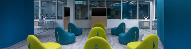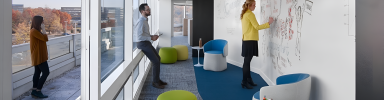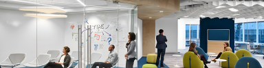 A typical floor is divided into neighborhoods, where shared pathways lead to different styles of huddle rooms, two sizes of conference rooms, workstations, whiteboard areas and other breakout spaces with soft seatings from Bernhardt Design. The circulation patterns and strategically placed community hubs encourage movement, choice and interaction. The 20,000-square-foot Noblis Innovation & Collaboration Center serves as a demonstration space for clients and the public, the centerpiece of a new headquarters that reflects this forward-thinking organization.