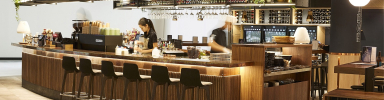 The Bridge Bar at Sydney Airport's interiors have been designed by the Luchetti Krelle team. Its warm and inviting atmosphere dominated by rich woody colors, creating a welcoming atmosphere for visitors.