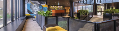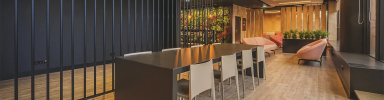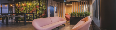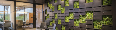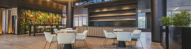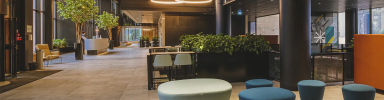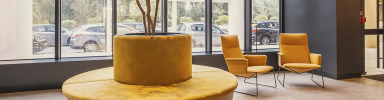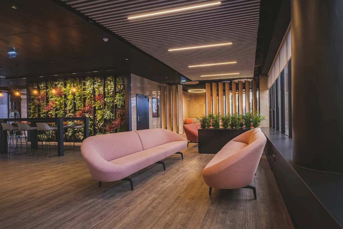 Savills Portugal undertook a project to refurbish the communal spaces of Lisbon's Green Park building in Portugal, with a particular focus on the entrance lobby. The main aim was to elevate the entrance area beyond mere functionality, creating a welcoming and visually pleasing space. Neutral tones of black and beige were deliberately selected to harmonize with the building's existing marble stone base. Additionally, the incorporation of natural elements like wood, green walls, and lush plants, along with the premium furniture selections from Andreu World, further enhance the feeling comfort and overall quality of the building.