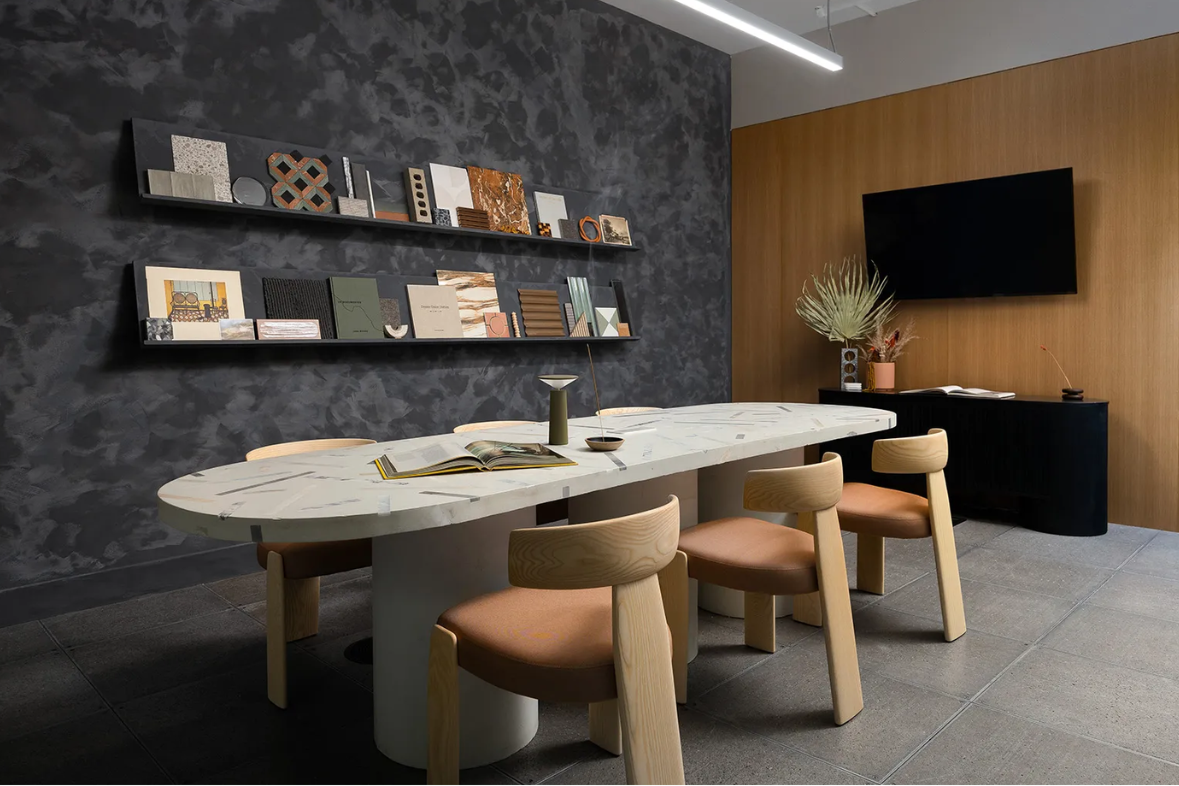 Established in 2025 and headquartered in Atlanta, HOF Studios specializes in game development and publishing for PC and console platforms. Their studio space features the Oru chair, skilfully designed by Patricia Urquiola for Andreu World. Drawing inspiration from 1970s design with a distinctive Japanese aesthetic, the Oru chair displays a playful and daring design, highlighted by its striking three-legged architecture, making it an ideal contrast piece for the studio ambiance.