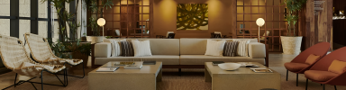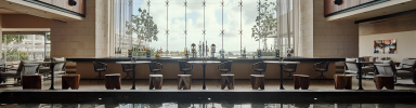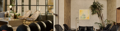 The sense of tranquility wrapping the whole place starts at the lobby. Floor-to-ceiling windows fill the lofty space with light. Everything here is about earthy tones and natural materials. Sofas, chairs and tables are smartly distributed as to arrange distinct sitting areas with plants and stone spheres insouciantly demarcating its borders.