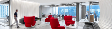 The space was intentionally designed to foster interaction, with multiple areas that encourage socialization and collaboration. Teams are naturally brought together as they navigate the office, creating opportunities for connection. At the heart of the design is the Belmont lounge chairs designed by Terry Crews for Bernhardt Design, which features layered foam of varying densities for added comfort and a tall back for head support. The result is a sleek, modern workplace that exudes professionalism and energy, while also reflecting the flight-to-quality trend currently shaping the office market.