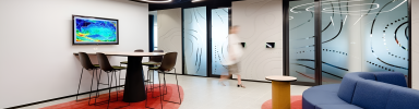 The office's aesthetic appeal are curated through carefully selected collections, including the contemporary and versatile Neighborhood Modular Sofa from Bernhardt Design. This sofa provides a welcoming and adaptable seating arrangement, fostering a collaborative atmosphere. In addition, the space also features the stylish Reverse Bar Table by Andreu World, adding a touch of sophistication to the office's communal spaces. This piece not only serves as a functional element but also contributes to the overall aesthetic coherence of the workspace.