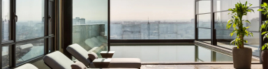 On the fourteenth floor, the Caprice Sky Bar offers panoramic views of the city and the Atlantic ocean. It stands out for its great attention to detail. By the cocktail bar, three Lapala stools in black invite guests to order a nice cocktail and maybe engage in small talk with the barman.
