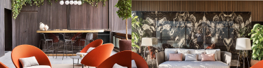 But many people prefer to sit around a table and enjoy a more private atmosphere. This is why several sets of the Twins Lounge Chair in an attractive orange oxide finish are placed in the lounge. These pieces along with the Grada Tables increase the sense of warmth, setting a very refined yet relaxing ambiance.