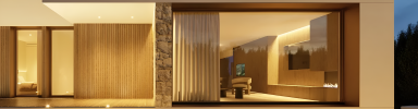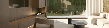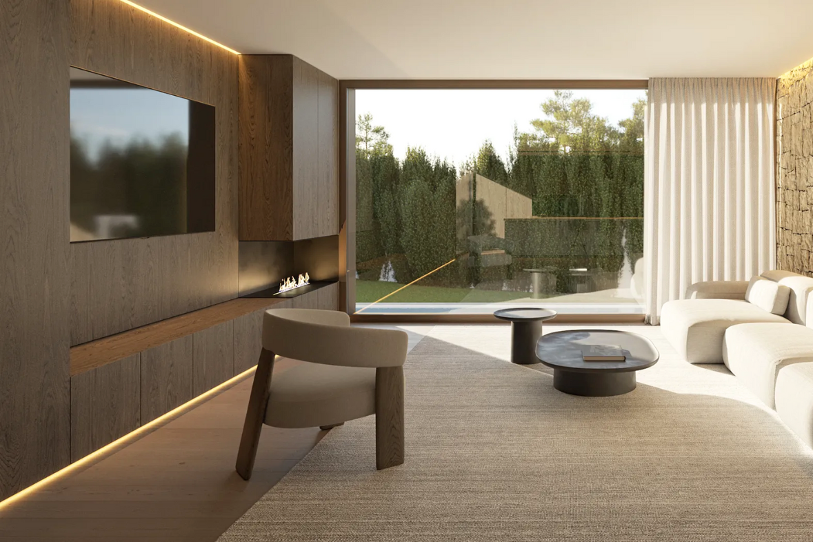 In the living room area, the Oru lounge chair continues the theme of bold yet tranquil design. Also designed by Patricia Urquiola, this lounge chair offers the same distinctive three-legged structure, providing both comfort and a statement piece within the room. The Oru collection's innovative design fits perfectly with the house, creating a cohesive and tranquil environment that is both stylish and efficient.