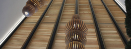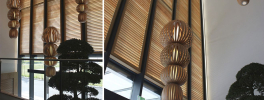 From the very first impact, the design calls attention to a delicate balance between east and west. The reception area separates visitors from the office environment by enveloping them in elements central to the Japanese aesthetic: a tall, live bonsai reaches up into an atrium and is met by natural woven-reed lighting elements by LZF Totem.