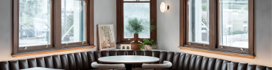 The ground floor now boasts an intimate, trattoria-style public bar featuring dark leather finishes and stained timber joinery. The space is anchored by a new central fireplace with a rippled granite hearth, around which the restaurant floorplan is organized.