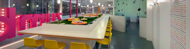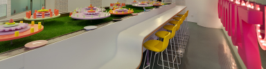 Luchetti Krelle designed a Sydney patisserie as a homage to Charlie and the Chocolate Factory for a prominent confectionary figure. The establishment features a unique layout with a non-traditional patisserie on one side, allowing patrons to observe desserts displayed behind glass, akin to an art gallery, and place orders with staff members. On the opposite side, there is a café area furnished with high stools around a central bench, where customers can select desserts from a conveyor belt in motion. The whimsical café is adorned with Lottus stools from Enea.