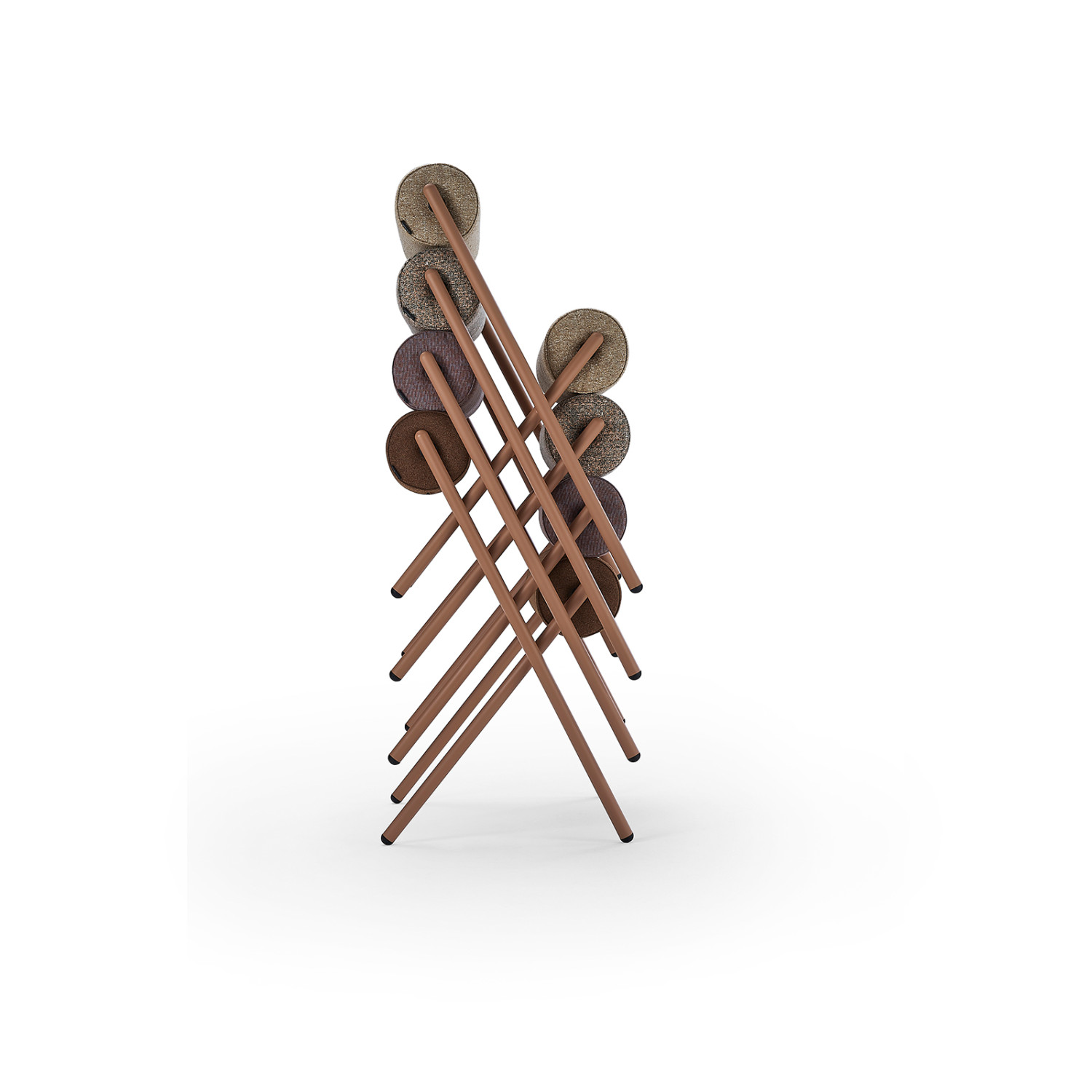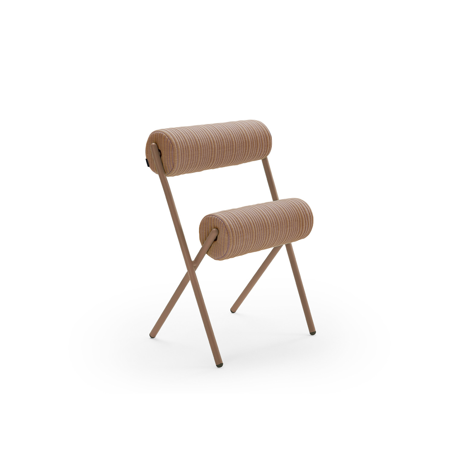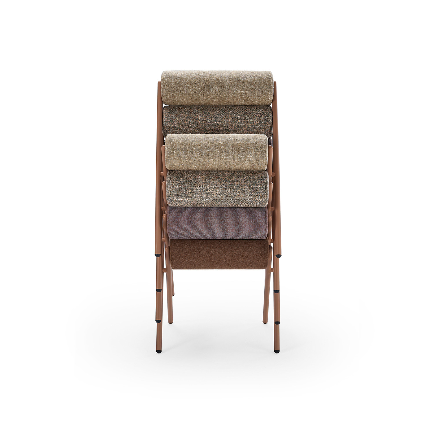 Perhaps Roll chair’s complex simplicity may mislead you at first, as well as its inspirational concept. Maybe this is the most ironic and contemporary design created by Mut. Inspired by the leg presses that can be found in gyms, this original seat rejects the main role of these machines: Roll offers rest to those who need a calm pause. Avoiding superfluous ornaments and details, the Valencian creatives reduce the conventional shape of a chair to two pure elements: steel tubes and two cylindrical pads for back and seat. Their passion for the inner charm of simple things and the rounded figures are part of Mut’s hallmarks and they are also present in their new design for Sancal. Its unusual silhouette turns an industrial object into a work of art, extenuated still further if stacked to form a sculptural figure. In this way, Roll combines balance, beauty and functionality. The short list of materials used does not limit the possibilities for personalization, as their cushions can be upholstered in any of Sancal’s fabrics and twelve lacquers colours available for the metal structure. On the other hand, this rationalization of raw materials makes it more sustainable and simplifies its recycling process once its useful life has ended; although we anticipate it will be very long as Roll is designed to last, both for its timeless design and its quality.